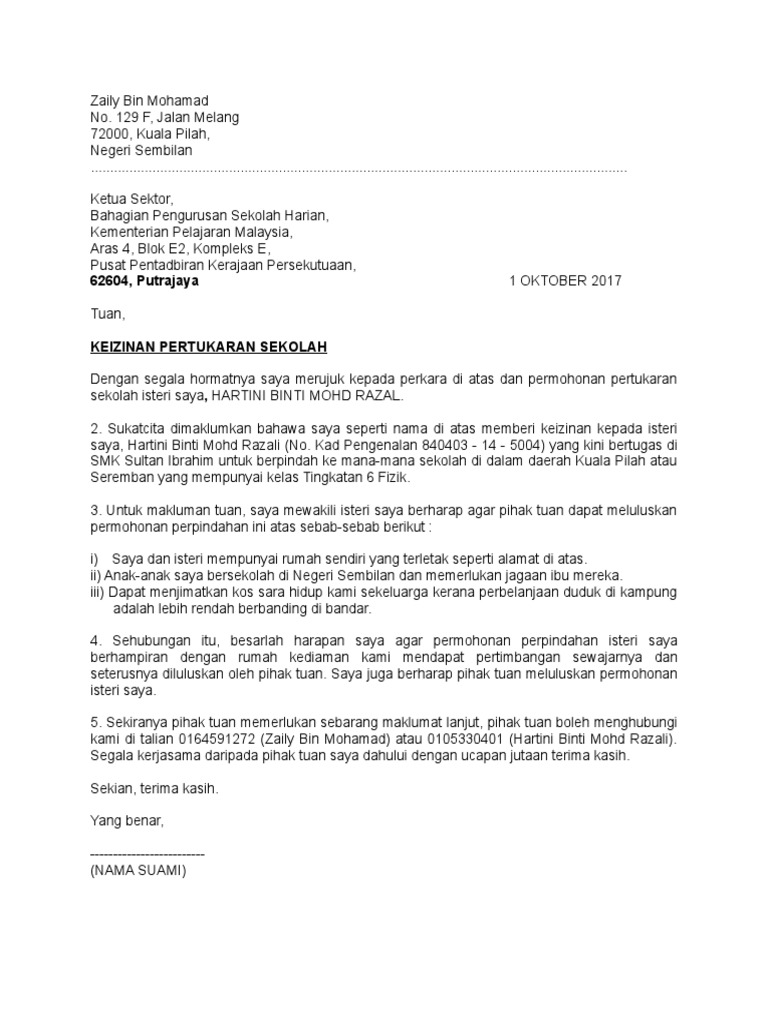 Kepada Pegawai Pelajaran Daerah Pejabat Pelajaran Daerah Sandakan Beg Berkunci 02. Contoh surat pertukaran sekolah rendah. Tarikh pertukaran yang dikehendaki.